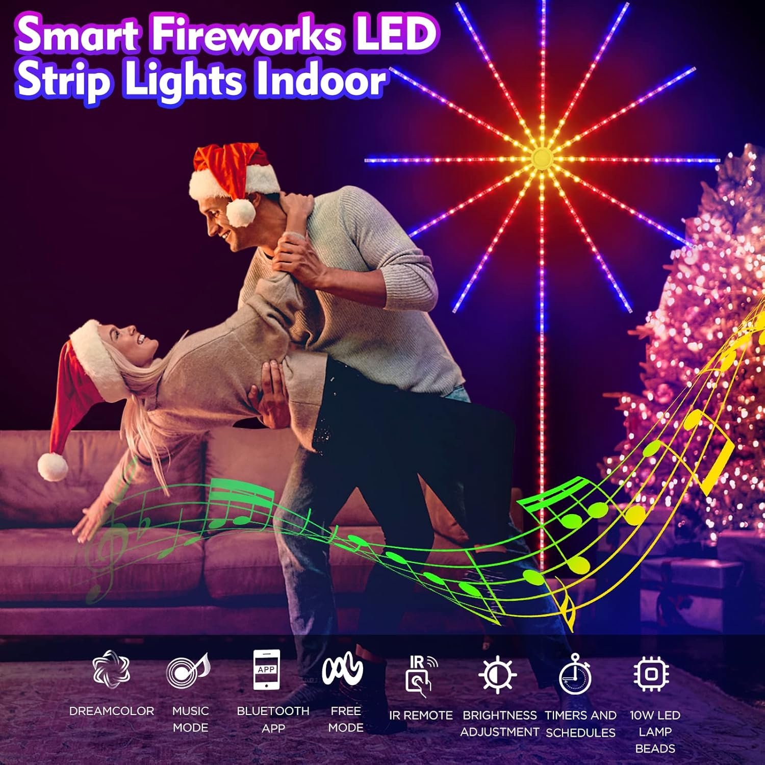 🎇🎅【مزامنة مع الموسيقى والاستمتاع】- هل تريد إضاءة محيطة للغرفة تتزامن مع الموسيقى؟ انظر هنا، تأتي أضواء الألعاب النارية الذكية مع وضع الموسيقى مع ميكروفون مدمج عالي الحساسية يغير لون وإيقاع شريط الإضاءة وفقًا للموسيقى أو الطبول أو الجيتار أو التحدث أو أي صوت. تتزامن الأضواء مع الإيقاع، وطيفها الديناميكي، وترقص الأضواء على الإيقاع، مما يجعل أضواء الألعاب النارية الخاصة بك أكثر حيوية وروعة، مما يخلق جوًا رومانسيًا.